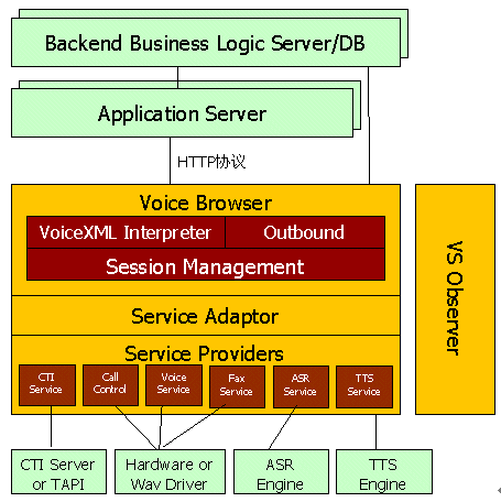 用于存放和產生VoiceXML腳本,可以是文件系統(tǒng)或WEB服務器,一般文件系統(tǒng)應用于靜態(tài)腳本,WEB服務器應用于動態(tài)腳本;應用邏輯組件或中間件,進行事務處理。