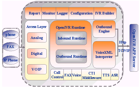 OpenIVR通過了業(yè)界主要的CTI中間件和PBX集成測(cè)試,是呼叫中心系統(tǒng)IVR服務(wù)器的理想選擇;而集成商只需簡(jiǎn)單掌握VoiceXML語言,就可以方便地定制業(yè)務(wù)及流程;下面是 OpenIVR系統(tǒng)結(jié)構(gòu)圖: