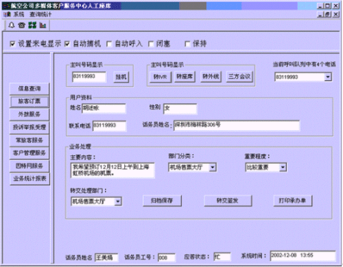 。。本系統(tǒng)支持與航空聯(lián)網(wǎng)售票系統(tǒng)聯(lián)網(wǎng),進行實時售票信息交流,時刻更新本系統(tǒng)內(nèi)部數(shù)據(jù)庫的部分資料,以保持與售票大廳、各訂票營業(yè)點同步;同時,本系統(tǒng)與貨物托運信息系統(tǒng)保持同步信息傳遞。 博宇航空公司客戶服務中心系統(tǒng)將航空公司內(nèi)分屬各部門為客戶提供的服務,集中在一個統(tǒng)一的對外聯(lián)系"窗口",實現(xiàn)一個電話、傳真、電子郵件、因特網(wǎng)瀏覽、手機、短消息、或網(wǎng)絡電話等解決客戶所有疑難問題的目標。