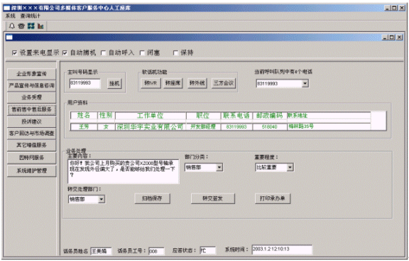 ◇提高企業(yè)親切感:系統(tǒng)在人工服務狀態(tài)下,當業(yè)務代表輸入客戶名稱時,系統(tǒng)即時將客戶與企業(yè)相關的信息顯示在座席終端上,使業(yè)務及時了解客戶,有針對性回答客戶問題,使客戶倍感親切。