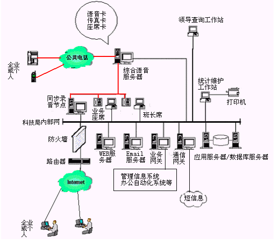 應(yīng)用現(xiàn)代先進(jìn)的CTI技術(shù)建立的科技局公開電話系統(tǒng),改變了傳統(tǒng)的科技局辦公的一部電話、一支筆、一個本(或用計算機(jī)當(dāng)打字機(jī))的記錄、交流模式。在充分利用各級科技局現(xiàn)有辦公自動化系統(tǒng)基礎(chǔ)上,通過共享科技局、社會網(wǎng)絡(luò)資源,能夠為企業(yè)或個人提供了更多、更好、更便捷的服務(wù)。