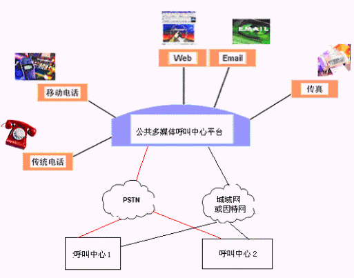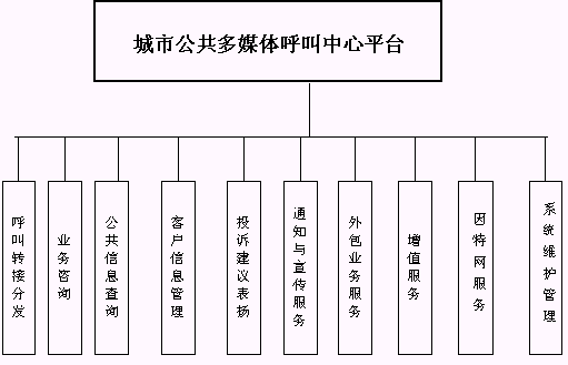客戶利用電話、傳真、電子郵件、因特網(wǎng)、手機、短消息等進(jìn)入城市公共多媒體呼叫中心平臺,本系統(tǒng)依托現(xiàn)有各專業(yè)呼叫中心/使用城市公共多媒體呼叫中心平臺租賃服務(wù)的企事業(yè)單位的各類業(yè)務(wù)技術(shù)支持系統(tǒng)和網(wǎng)絡(luò)系統(tǒng),通過人工受理或自動語音服務(wù)等方式全天24小時不間斷地為客戶提供各種服務(wù)。