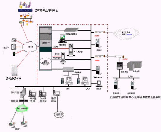 實現(xiàn)共享已有呼叫中心業(yè)務(wù)系統(tǒng)的資源:通過城域網(wǎng)或因特網(wǎng)實現(xiàn)與現(xiàn)有呼叫中心相關(guān)業(yè)務(wù)系統(tǒng)的連接與集成,諸如業(yè)務(wù)數(shù)據(jù)的提取等。一期工程留有相應(yīng)的接口。