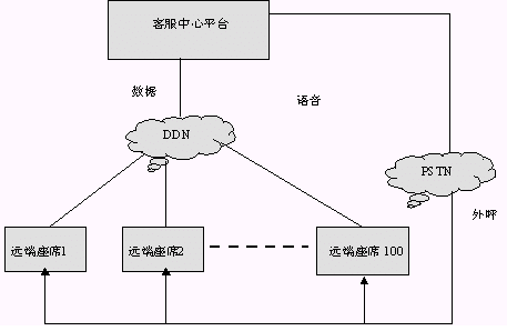 所謂PSTN+DDN的聯(lián)網(wǎng)方式是遠(yuǎn)端座席和主呼叫中心的語音和數(shù)據(jù)互連是分開來的,彼此互相不干擾。語音方面遠(yuǎn)端座席和主呼叫中心的相聯(lián)與前兩種方式不同,是主呼叫中心通過外呼將話路接到遠(yuǎn)端座席處。數(shù)據(jù)方面遠(yuǎn)端座席和主呼叫中心的相聯(lián)仍然直接通過DDN相連。