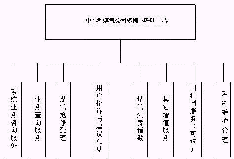 客戶利用電話、手機等撥打某一特服號碼(如9xxxx)進入中小型煤氣公司多媒體呼叫中心系統(tǒng),本系統(tǒng)依托煤氣公司各類業(yè)務技術支持系統(tǒng)和網(wǎng)絡系統(tǒng),通過人工受理或自動語音服務等方式全天24小時不間斷地為客戶提供各種服務。