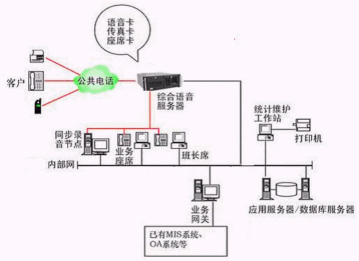 本系統(tǒng)物理結構由帶語音板卡的高性能工控機(稱為綜合語音服務器,在功能上可以分為CTI服務器、IVR(交互式語音應答)/IFR服務器、統(tǒng)計維護管理工作站、數(shù)據(jù)庫/應用服務器、錄音留言工作站、業(yè)務網(wǎng)關服務器、業(yè)務代表座席、網(wǎng)絡系統(tǒng)等和應用軟件構成。