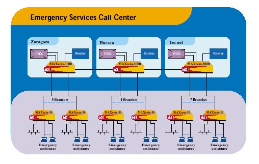 在阿拉貢地區(qū)撥打112可以接通Zaragoza、Huesca或Teruel三地的最近的呼叫中心。在接線員點(diǎn)擊電子地圖上呼叫方所在位置后,呼叫便通過(guò)MAXcess設(shè)備自動(dòng)路由到離呼叫方最近的分支機(jī)構(gòu)的專(zhuān)用電話上。接下來(lái),該分支機(jī)構(gòu)便立即派出緊急救護(hù)車(chē)。接線員輸入到系統(tǒng)中的有關(guān)事件的信息也可以通過(guò)LAN立即到達(dá)遠(yuǎn)端MAXcess。