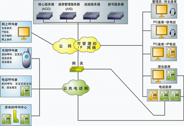 | 支持多種呼入方式 | 普通電話呼入、消息(e-mail、語音留言、傳真)呼入、Internet呼入。 | ![]() |