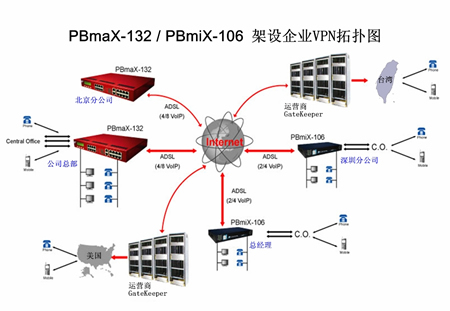 對(duì)于具有多個(gè)分支機(jī)構(gòu)的公司,PBmaX/PBmiX系列IP-PBX能夠通過內(nèi)建的VoIP通道將各分支機(jī)構(gòu)連接起來。使撥打遠(yuǎn)程分機(jī)如同撥打本地分機(jī) 一樣簡(jiǎn)單,且無需支付任何長(zhǎng)話費(fèi)用。
