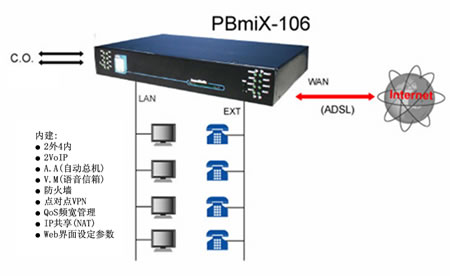 在21世紀(jì)的今日,隨著網(wǎng)絡(luò)應(yīng)用的普及,無論是個(gè)人或企業(yè)對(duì)于交換機(jī)的觀念若仍拘泥于傳統(tǒng)的思維,將是落伍的。免費(fèi)網(wǎng)絡(luò)電話、分散式系統(tǒng),將是傳統(tǒng)交換機(jī) 在增加語(yǔ)音信箱/自動(dòng)總機(jī)功能之后,系統(tǒng)機(jī)制的重大變革。本公司推出的PBmaX/PBmiX系列IP-PBX,不但將上述所有功能整合于一體,進(jìn)一步可內(nèi)建公司VPN、Web服務(wù)器、GateKeeper等功能,呈現(xiàn)出數(shù)字交換機(jī)的全新風(fēng)貌,并將新的電話使用觀念帶進(jìn)企業(yè)、SOHO辦公室與家庭內(nèi)。