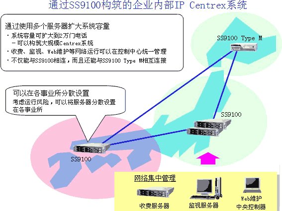 多個SS9100服務器相互協(xié)作,擴大了系統(tǒng)整體容量。以往模型由1個服務器構(gòu)成,系統(tǒng)最大只能容納5千門電話,而SS9100 R5可以構(gòu)筑將系統(tǒng)整體容量擴展到容納2萬門電話的大規(guī)模Centrex系統(tǒng)。進而,通過將服務器分散設置在各事業(yè)所的形式,可以考慮分散各事業(yè)所之間故障危險的基礎上構(gòu)筑系統(tǒng)。