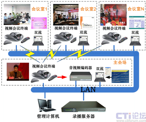 當需要錄制沒有錄播的其他會議室實況時,通過主會場視頻會議終端呼叫任意會場的終端,即可錄制任意會場的會議實況,如下圖: