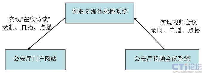 如圖所示,銳取多媒體錄播系統(tǒng)前端的視音頻編碼器采集視頻會(huì)議系統(tǒng)攝像機(jī)拍攝的公安機(jī)關(guān)領(lǐng)導(dǎo)或?qū)<以诰交流的視頻圖像和交流現(xiàn)場的聲音,將采集的視頻和音頻信號(hào)通過網(wǎng)絡(luò)傳輸?shù)胶笈_(tái)的多媒體錄播服務(wù)器中。服務(wù)器的錄制模塊將從視音頻編碼器接收到的信號(hào)進(jìn)行同步組合錄制,錄制的文件存儲(chǔ)在服務(wù)器的硬盤上。服務(wù)器的點(diǎn)播模塊調(diào)用硬盤中已錄制的文件實(shí)現(xiàn)點(diǎn)播功能。服務(wù)器的直播模塊將從視音頻編碼器接收到的信號(hào)分發(fā)到網(wǎng)絡(luò)上,需要觀看“在線訪談”直播視頻的網(wǎng)民只需登錄省公安廳政府門戶網(wǎng)站,安裝專用客戶端軟件就能接收到公安機(jī)關(guān)領(lǐng)導(dǎo)或?qū)<以诰交流的實(shí)時(shí)內(nèi)容。通過客戶端軟件的在線交流功能,觀看直播的網(wǎng)民還可以向公安機(jī)關(guān)領(lǐng)導(dǎo)或?qū)<姨釂,真正?shí)現(xiàn)了“在線訪談”貼近群眾、服務(wù)群眾的目標(biāo)。