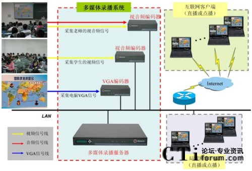 廣州市旅游職業(yè)學校多媒體錄播系統(tǒng)組網(wǎng)如上圖所示。在本項目中編碼器和多媒體錄播服務器分別部署在教室和機房內(nèi),前端的視音頻編碼器采集老師、學生的視音頻信號,VGA編碼器采集PPT內(nèi)容,編碼器采集信號并編碼后通過網(wǎng)絡發(fā)送給多媒體錄播服務器,多媒體錄播服務器接收并實現(xiàn)同步錄制、直播及事后點播。老師、學生可在教室、辦公室、宿舍等任何可以連接校園網(wǎng)的地方實時觀看教室內(nèi)進行的課程,可滿足日常多媒體教學、課件錄制、微格教學等應用的需要。