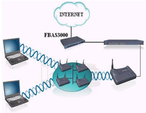 移動(dòng)用戶通過自身的無線網(wǎng)卡傳遞信息到熱點(diǎn)接收器上,熱點(diǎn)接收器連接到交換機(jī)(是為了能具有更好的可拓展性),交換機(jī)連接到華夏科技FutureWorks寬帶計(jì)費(fèi)系統(tǒng)的FBAS接入服務(wù)器上,通過接入服務(wù)器連接到INTERNET.這里的FBAS3000系列的寬帶接入服務(wù)器采用的是一體機(jī)的模式,接入,認(rèn)證,計(jì)費(fèi)等一系列服務(wù)均安裝在FBAS里,這樣可以簡化網(wǎng)絡(luò)結(jié)構(gòu)。對(duì)FBAS的操作是通過WEB頁面來進(jìn)行設(shè)置維護(hù)的,