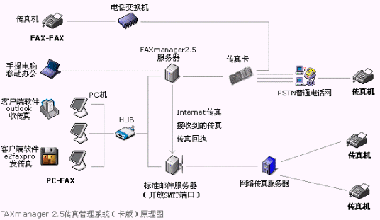 FAXmanager 2.5傳真管理系統(tǒng)安裝在局域網(wǎng)的一臺(tái)專用服務(wù)器上,運(yùn)行環(huán)境可以是:Windows98/NT/2000/XP等,此服務(wù)器可以同郵件服務(wù)器為同一臺(tái)機(jī)器,構(gòu)成企業(yè)郵件/傳真專用服務(wù)器,F(xiàn)AXmanager 2.5可以和企業(yè)郵件系統(tǒng)或群件系統(tǒng)整合使用,可以是Unix/Linux環(huán)境的Qmail和Sendmail等郵件系統(tǒng),也可以是Microsoft Exchange和Lotus Domino/Notes等群件系統(tǒng),當(dāng)然也可以是IComMail等企業(yè)郵件系統(tǒng),也支持虛擬主機(jī)設(shè)置企業(yè)郵局開設(shè)POP3帳戶和上網(wǎng)代理服務(wù)器的使用環(huán)境。