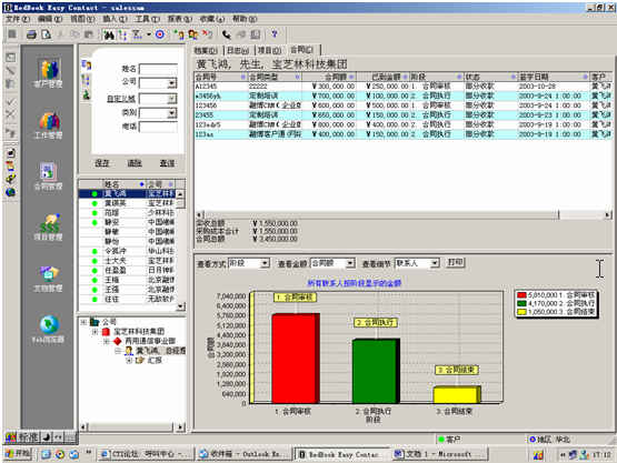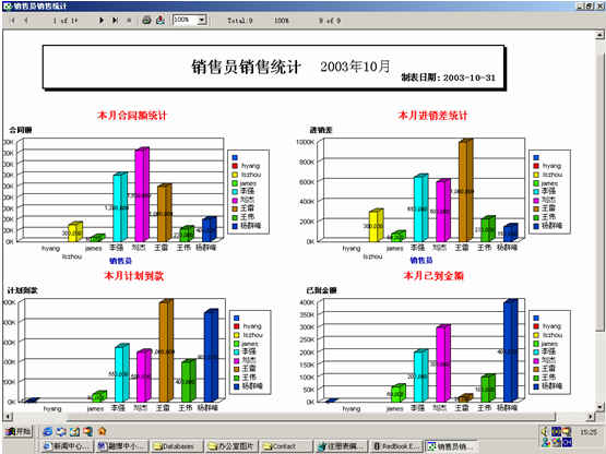 可對客戶(雇員)合同,根據(jù)合同階段、月份、合同金額、合同應(yīng)收應(yīng)付款、采購成本、客戶、銷售人員等條件進(jìn)行查詢和統(tǒng)計, 查詢統(tǒng)計結(jié)果以詳細(xì)列表及圖示進(jìn)行顯示。