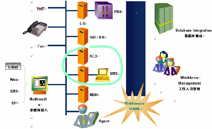 該模塊基于遠(yuǎn)東哈里斯公司先進(jìn)的H20-20 IXP2000多業(yè)務(wù)智能程控交換機(jī),采用遠(yuǎn)東哈里斯公司成熟的外置式ACD自動呼叫分配引擎作為電話用戶接入的交換設(shè)備。采用惠普服務(wù)器作為客戶服務(wù)中心CTI服務(wù)器和IVR服務(wù)器。網(wǎng)絡(luò)設(shè)備采用CISCO交換設(shè)備。人工座席采用1B+1D數(shù)字話機(jī)或者軟電話的語音接入方式,提供座席與交換機(jī)的連接,人工座席計算機(jī)采用標(biāo)準(zhǔn)的TCP/IP網(wǎng)絡(luò)協(xié)議與CTI中心服務(wù)連接。