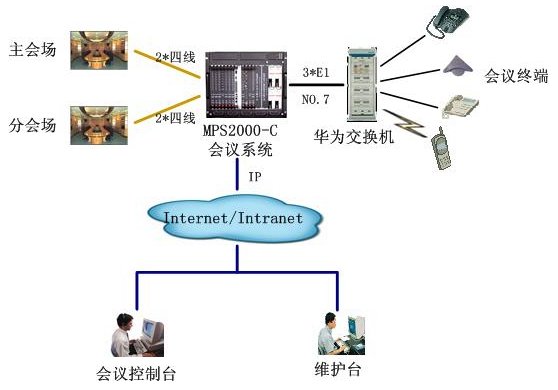 該會議系統(tǒng)和廊坊電力的會議系統(tǒng)組網(wǎng)方式相同,通過3個數(shù)字中繼,與華為用戶交換機(jī)互連,通信采用NO.7信令。4路4線中2路接主會場調(diào)音臺,2路接分會場調(diào)音臺,實現(xiàn)會議室擴(kuò)音設(shè)備的接入。通過以太網(wǎng)口與D-LINK網(wǎng)絡(luò)交換機(jī)互連,接入秦皇島電力的局域網(wǎng),實現(xiàn)維護(hù)管理及會議控制等功能。