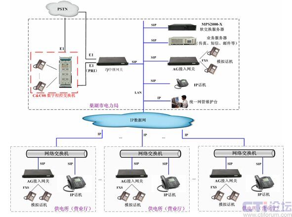巢湖電力市區(qū)下屬15個(gè)供電營業(yè)廳以及一個(gè)局屬單位。在信息中心配置可以I+1 熱備的MPS2000-X軟交換系統(tǒng),通過TG提供的E1與華為的C&C08對接出局,在每個(gè)供電營業(yè)廳放置AG 15套。系統(tǒng)建成后將華為的行政電話延伸到各個(gè)供電營業(yè)廳,各營業(yè)廳之間、供電公司和營業(yè)廳之間分機(jī)號碼互撥,有來電顯示,系統(tǒng)充分利用原有的通信網(wǎng)絡(luò)資源,節(jié)約投資及成本。