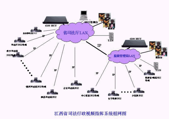 江西司法視頻會議系統(tǒng)的拓?fù)浣Y(jié)構(gòu)如圖所示。整個視頻會議系統(tǒng)為星型拓?fù)浣Y(jié)構(gòu),其中二級網(wǎng)以省司法廳和省監(jiān)獄管理局為主會場,放置2個MCU;另外,包括11個地市司法局的分會場(南昌、九江、贛州、吉安、撫州、鷹潭、萍鄉(xiāng)、新余、上饒、景德鎮(zhèn)、宜春),14個監(jiān)獄和農(nóng)場分會場,傳輸網(wǎng)絡(luò)為2M IP網(wǎng)絡(luò),視頻會議協(xié)議為H.323;司法局和監(jiān)獄管理局也可以單獨成網(wǎng),在分別依托省司法廳和省監(jiān)獄管理局MCU的情況下,各地市司法局或監(jiān)獄系統(tǒng)可與省司法廳或省監(jiān)獄管理局單獨進行雙向的視頻會議,整個系統(tǒng)具有很強的靈活性和擴展性。