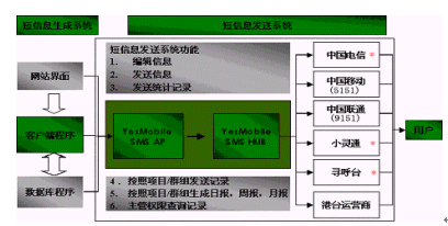 用戶可以通過(guò)HTTP方式,或是YesMobile客戶端軟件或者用戶定制完成短信發(fā)送。