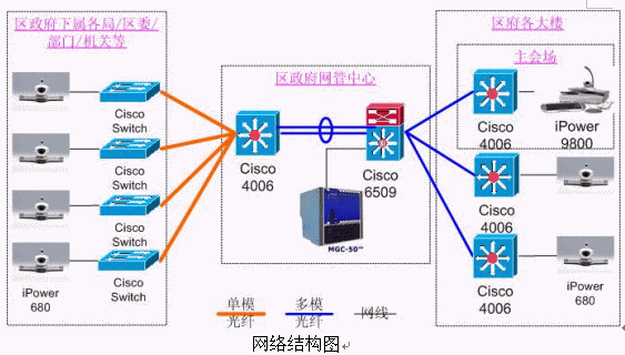 9800,分會場使用iPower 680。網(wǎng)管中心安放一臺Polycom 公司的MGC-50(多點會議控制單元),用于對全網(wǎng)終端的控制,實現(xiàn)多點間、點對點會議。各視頻設備通過網(wǎng)線連接在各主要交換機上。