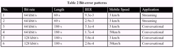 在H.264/AVC的標(biāo)準(zhǔn)化進(jìn)程中,移動視頻傳輸?shù)闹匾砸呀?jīng)在3G移動傳輸里面通過對基于H.324M的電路交換會話服務(wù)、包交換會話和流服務(wù)得到了證實(shí)。這些測試情況允許適當(dāng)?shù)木幋a特征、測試和容錯仿真等特征的選擇,同時也可以得到有意義的測試結(jié)果。在本文,我們將會把重心集中在基于IP的測試情況。在正常的測試情況下,我們會定義6個測試情形組合,主要測試通過3G移動網(wǎng)絡(luò)的包交換會話服務(wù)和包交換流媒體服務(wù)。另外,測試環(huán)境包括簡單的脫機(jī)3GPP/3GPP2仿真軟件、程序接口和評估標(biāo)準(zhǔn)。無線信道使用專門生產(chǎn)用于移動無線信道仿真的位率差錯模板來進(jìn)行仿真。 位率差錯模板在物理層上和RLC/RLP層下來捕獲,因此,它們在實(shí)驗被用于物理層仿真。通過位率差錯模板實(shí)驗中得出的碼率、長度、位錯誤率和移動速度數(shù)據(jù)詳見下表2。