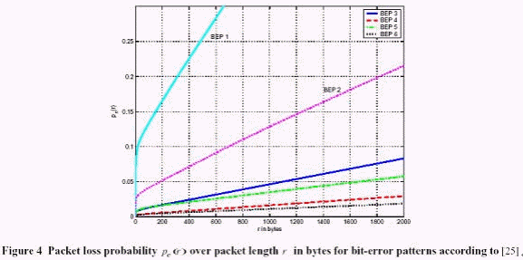 數(shù)組3到6的仿真結(jié)果更可靠,在會話應(yīng)用中需要低錯誤率的運(yùn)送者。 假定一任意的字節(jié)的開始位置在文件包可能發(fā)生錯誤的位置里面。 這些錯誤可能性的所有數(shù)據(jù)錯誤在圖4中被顯示。 明顯可以看出錯誤率會因為包長度的增加而提高。從位率錯誤表格(BEP1和2)可知,當(dāng)包長度減少的時候丟包率是不可以接受的, 舉例來說,500個字節(jié), 丟失可能性高達(dá)25%. 高的錯誤率需要在鏈路層上重傳。