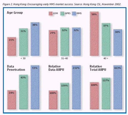 根據(jù)CSL的業(yè)績表明,香港也促進(jìn)了早期MMS市場的成功發(fā)展。MMS用戶的ARPU值比GSM用戶高132%。