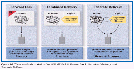 標(biāo)準(zhǔn)提供了三種DRM模式:Forward-lock,Combined Delivery和Separate Delivery。