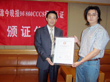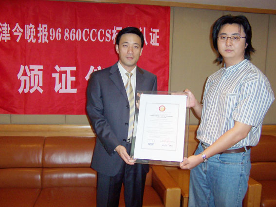 2004年9月9日,天津今晚報公眾服務(wù)中心通過了《全國呼叫中心運營績效標(biāo)準(zhǔn)》(CCCS-OP-2003)認證,并獲得由中國信息化推進聯(lián)盟客戶關(guān)系管理專業(yè)委員會頒發(fā)的認證證書(四星級客戶服務(wù)中心),成為國內(nèi)傳媒業(yè)首家通過此認證的呼叫中心。