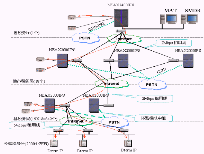 NEC公司為該省稅務(wù)提供了2003年全球同步推出的NEAX 2400及NEAX2000交換機(jī)系統(tǒng),為用戶(hù)提供了傳統(tǒng)時(shí)分交換系統(tǒng)和VoIP交換的完美結(jié)合,即具備VoIP功能又支持交換機(jī)的豐富功能,如豐富的終端,豐富的組網(wǎng)中繼和信令,語(yǔ)音信箱,多方會(huì)議,無(wú)線(xiàn)通信,統(tǒng)一計(jì)費(fèi)等等。