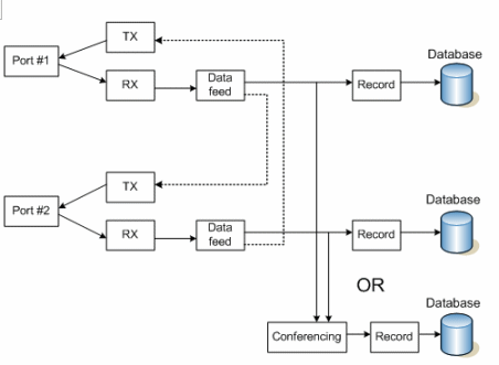上圖中的媒體和控制數(shù)據(jù)流表示通過Prosody S (HMP) 或Prosody X板卡建立的兩個(或多個)端點(diǎn)之間的呼叫。媒體流(RTP)和信令信息都通過監(jiān)控平臺本身傳輸,高級的應(yīng)用系統(tǒng)會記錄所有SIP/H.323事件和消息。傳真信息也可以存儲,保存在TiFF格式的圖形文件內(nèi)。這里,系統(tǒng)可以在兩端分別錄制RTP流,也可以采用會議的方式錄制在一起。