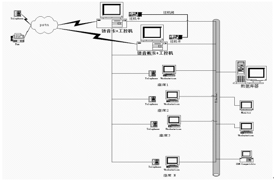在一些小型CALL CENTER系統(tǒng)中,人們通常通過語(yǔ)音板卡加工控機(jī)的方式搭建系統(tǒng),通常一臺(tái)設(shè)備就集成了ACD、IVR、CTI等各種資源,各資源的使用、調(diào)派通過軟件進(jìn)行控制,有效的解決了建設(shè)成本高、系統(tǒng)構(gòu)造繁復(fù)的問題,具有相當(dāng)?shù)撵`活性。然而由于工控機(jī)和語(yǔ)音板卡容量有限,同時(shí)其標(biāo)準(zhǔn)最多只能是工業(yè)級(jí)標(biāo)準(zhǔn),因此在構(gòu)建相對(duì)大型的呼叫中心時(shí)就總是捉襟見肘。為了增加系統(tǒng)容量,解決多臺(tái)PC之間進(jìn)行通道交換的難題,人們又設(shè)計(jì)了過機(jī)卡和過機(jī)線來(lái)解決,其應(yīng)用系統(tǒng)如下圖: