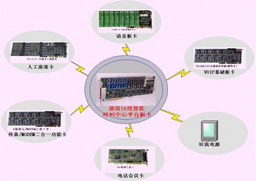 PCI 8內(nèi)線8外線語音/座席/傳真/MODEM四合一卡、DM032CN 32方電話會(huì)議卡、DM016D/CP 16線高倍語音壓縮/解壓卡等板卡。