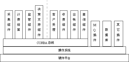 長話計費系統(tǒng)既包括計費結(jié)算系統(tǒng),又包括營業(yè)服務(wù)系統(tǒng),功能比較多,數(shù)據(jù)處理流程也相對復(fù)雜。 簡單的傳統(tǒng)數(shù)據(jù)庫的機械化編程已很難滿足系統(tǒng)對大數(shù)據(jù)量的處理及靈活性等方面的要求,因此在這套系統(tǒng)中,我們采用了一些當今業(yè)界的熱門技術(shù)。比如采用了CORBA軟總線思想和MQ Series消息管理隊列,也使之成為聯(lián)機計費系統(tǒng)平臺的一次成功實施。其系統(tǒng)層次結(jié)構(gòu)圖如下: