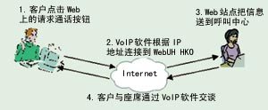 目前來講,把語音和Web在網(wǎng)絡上結合起來的理想途徑是VoIP。Web上的VoIP呼叫工作原理如圖1所示?蛻籼顚懸恍┗镜目蛻糍Y料后,點擊呼叫按鈕呼叫座席員。如果用戶的資料已經(jīng)在數(shù)據(jù)庫中的話,座席員就可以直接從瀏覽器上看到與該客戶相關的信息;如果用戶是第一次進入呼叫中心,座席員的瀏覽器上就會提示向客戶詢問并記錄客戶信息。對客戶來說,只需要一臺接入Internet的多媒體電腦和免費的客戶端軟件就可實現(xiàn)Web瀏覽和交談功能。