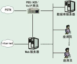 在處理來自Web的語音呼叫時,來電也必須與普通的語音來電一樣,經(jīng)過交換及排隊處理。將PBX、ACD、VoIP網(wǎng)關集成,使之既能處理來自Web的語音呼叫,也能處理來自PSTN的語音呼叫。