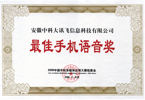 近日,首屆中國手機多媒體應用大賽組委會將“2006最佳手機語音獎”這份沉甸甸的獎牌和證書授予了科大訊飛。這一由數十位業(yè)界專家和百萬手機用戶慎重評選出的獎項,充分說明了科大訊飛在手機語音應用領域的領先地位,其分量不言而喻。