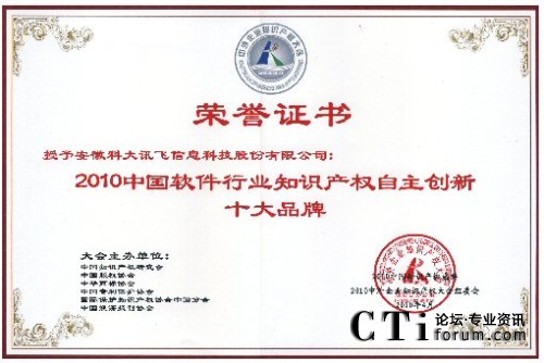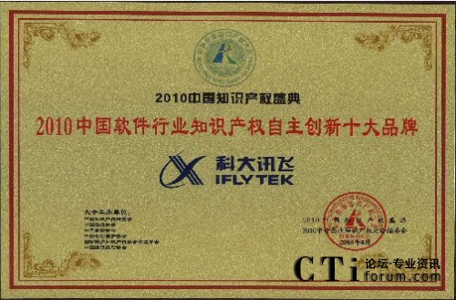 CTI論壇(ctiforum)4月29日消息(記者 潘婷婷):2010年4月25日,由中國知識產權研究會、中國專利保護協(xié)會、中國版權協(xié)會等單位聯(lián)合舉辦的“2010中外企業(yè)知識產權大會”在人民大會堂隆重舉行。在當日的“2010中國知識產權盛典頒獎典禮”中,科大訊飛憑借強大的自主創(chuàng)新能力以及在知識產權創(chuàng)造、保護與應用方面的突出表現(xiàn)獲評“2010年中國軟件行業(yè)知識產權自主創(chuàng)新十大品牌”。