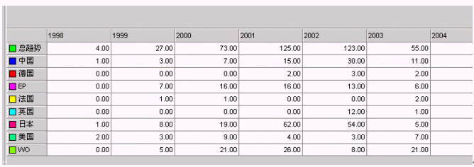 從圖1分析,98-2004年該領(lǐng)域技術(shù)發(fā)展大致分為3個(gè)周期,即98-2000年、2001-2003年、2003-2004年。目前正處于第三個(gè)周期后期。