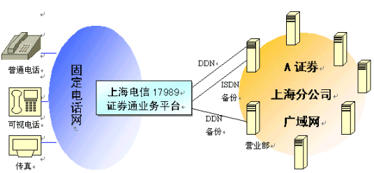 "17989證券通"服務是上海電信和黎明網(wǎng)絡共同向上海地區(qū)證券公司提供的通道外包式綜合服務。與電信提供的傳統(tǒng)的固定通道收費服務不同,"17989證券通"服務的顯著特色是"集中交易,按需服務"。該項服務自推出以來,就以其低成本、集中式電話交易和大量增值服務贏得了許多證券公司的普遍關(guān)注。下面是某大型綜合性證券公司采用"17989證券通"服務的案例剖析。