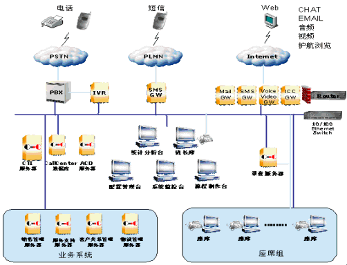 。。系統(tǒng)采用PBX提供完備的呼叫控制功能,能夠滿足呼叫中心電話應用的需要,實現呼入、呼出、內部通話、保持、接回、咨詢、轉接、會議等各種電話控制功能;同時,PBX具有CTILink接口,可實現與計算機系統(tǒng)的連接。