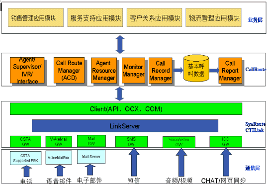 。。CallRoute平臺是一個基于CSTA標準、支持分布互連的呼叫中心平臺。商路通呼叫中心平臺全套產品包括多個服務部件,客戶端的接口部件(OCX、DLL)以及功能豐富應用工具。我們的軟件系統(tǒng)采用先進的軟件工程設計方法,整個系統(tǒng)的軟件結構體系遵循以下設計原則: