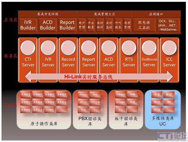 在擁有第五代呼叫中心Hi-Link核心軟件的商路通公司看來(lái),呼叫中心軟件架構(gòu)包含三層,基礎(chǔ)層、服務(wù)層和應(yīng)用層。而統(tǒng)一通信UC應(yīng)從劃入基礎(chǔ)層及服務(wù)層之中,PBX驅(qū)動(dòng)類(lèi)庫(kù)和板卡驅(qū)動(dòng)類(lèi)庫(kù)處理電話媒體的請(qǐng)求,而多媒體類(lèi)庫(kù)用于處理其他統(tǒng)一通信的媒體,如傳真、短信、電子郵件、均包含在多媒體類(lèi)庫(kù)之中。傳真、短信、電子郵件等請(qǐng)求分別由FAX