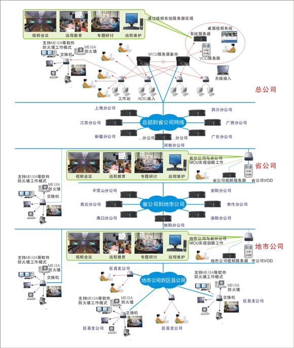 整個(gè)網(wǎng)絡(luò)覆蓋到遍布全國(guó)各地的省級(jí)分公司35家,二級(jí)分公司348家,縣級(jí)分公司2667家,營(yíng)業(yè)網(wǎng)點(diǎn)幾千個(gè),整個(gè)網(wǎng)絡(luò)共400多臺(tái)MCU,5000多個(gè)終端。整個(gè)系統(tǒng)采用三級(jí)級(jí)聯(lián)樹(shù)狀組網(wǎng),各級(jí)分級(jí)分權(quán)管理,全網(wǎng)統(tǒng)一調(diào)度,全網(wǎng)終端統(tǒng)一開(kāi)會(huì)。
