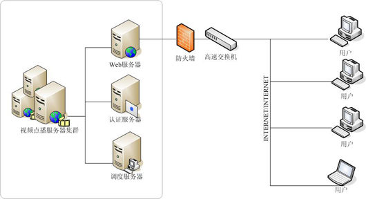 客戶可以通過訪問放置在甘肅省移動(dòng)公司面機(jī)房內(nèi)的Web服務(wù)器,同時(shí)WEB服務(wù)器發(fā)送請(qǐng)求到認(rèn)證服務(wù)器,通過客戶AAA級(jí)認(rèn)證后的,客戶經(jīng)過調(diào)度服務(wù)器將請(qǐng)求反饋給視頻服務(wù)器,完成視頻點(diǎn)播流程,具體架構(gòu)如圖。
