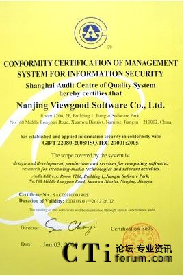 CTI論壇(ctiforum)07月17日消息: 日前,VIEWGOOD順利通過ISO27001信息安全管理體系國際認證,成為首家通過該項認證的專業(yè)流媒體技術供應商。此舉標志著VIEWGOOD在保障信息安全、提升企業(yè)管理水平方面,已經全面接軌國際水平,并居于業(yè)內領先地位。