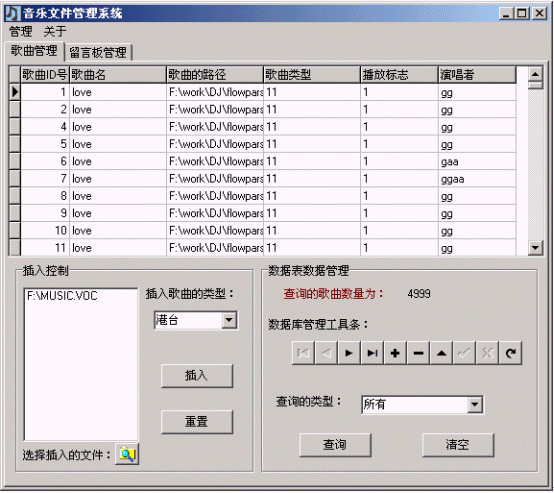 本軟件專門設(shè)計(jì)用來管理彩話系統(tǒng)中的音樂文件?捎迷撥浖M(jìn)行歌曲的管理,包括插入,查詢,修改,刪除等操作。